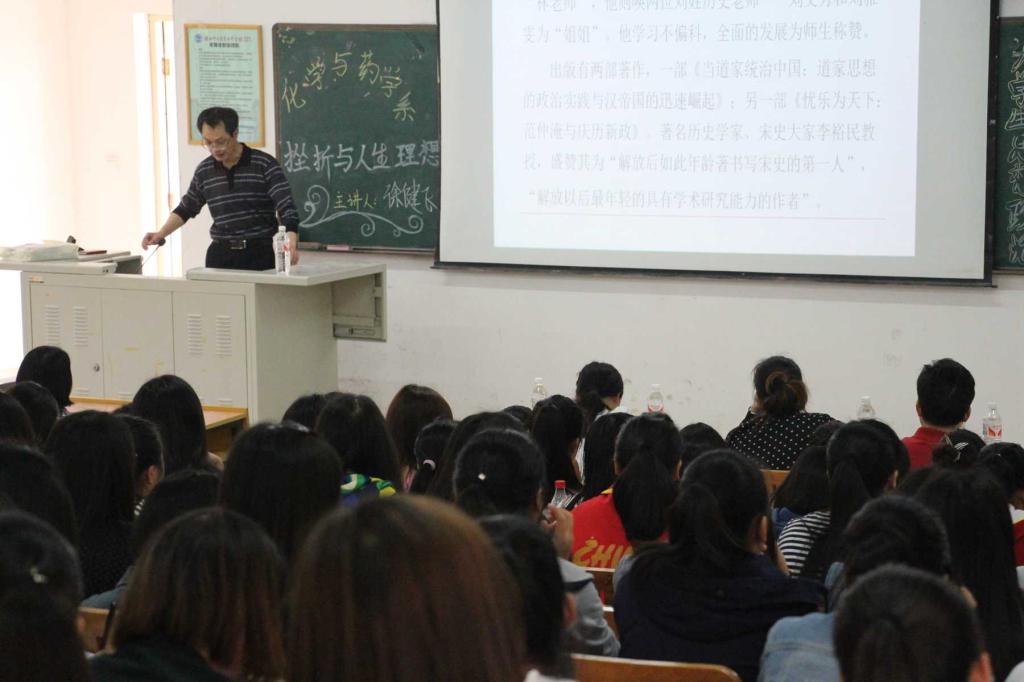 4月15日下午,mobile.48365365.com在9号教学楼212教室举办“挫折与人生理想”主题讲座。化药系各年级300余名学生聆听了徐健飞教授的讲座。